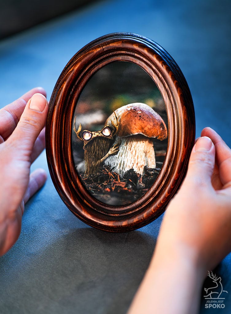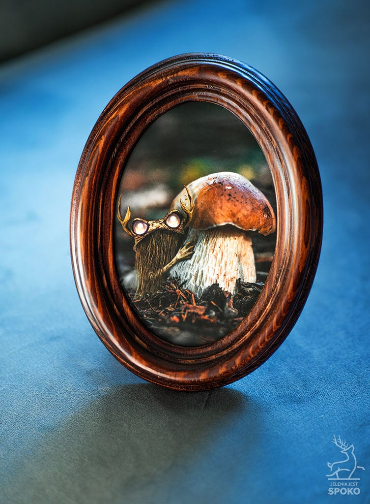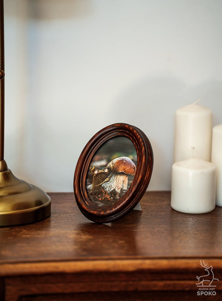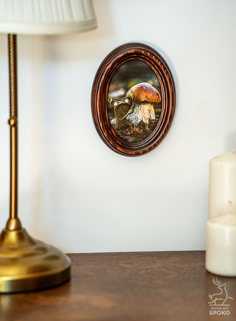 Gotowy do podziwiania zaraz po wyjęciu z pudełka SPOKO MiniWydruk BESTIA Borowiec Wielki w uroczej i nietuzinkowej owalnej ramce.