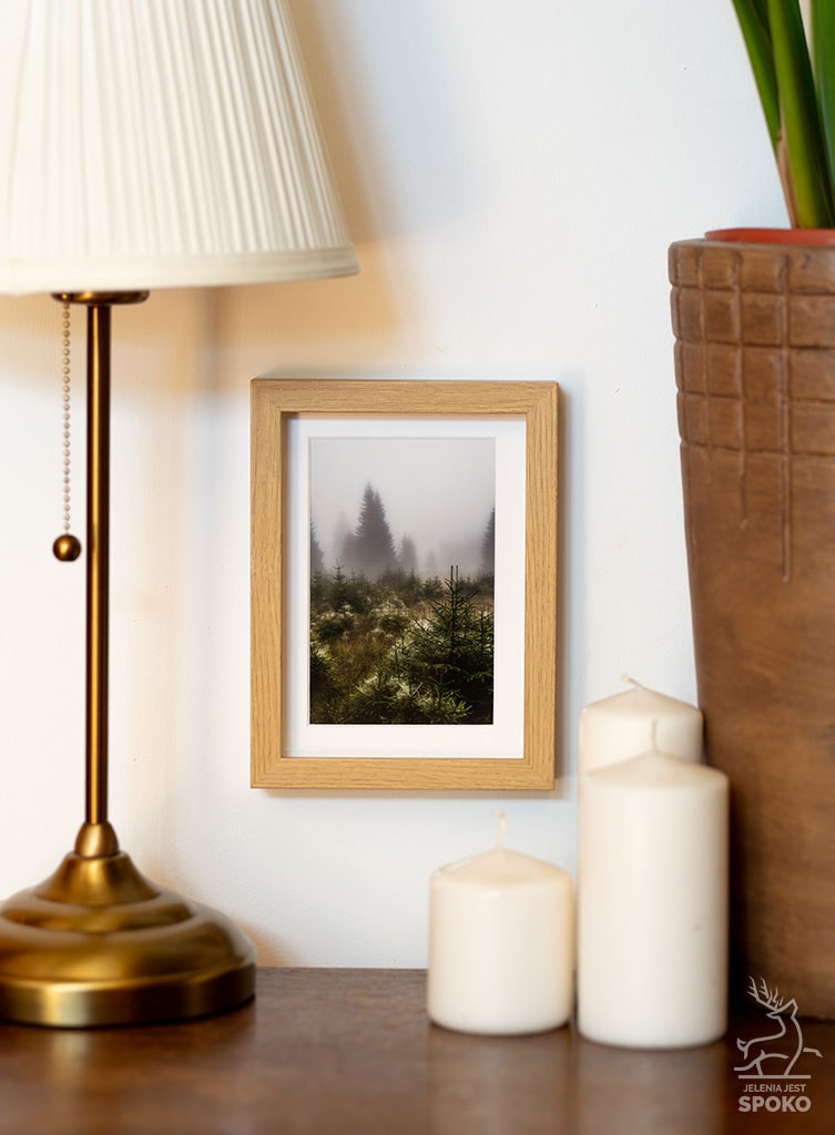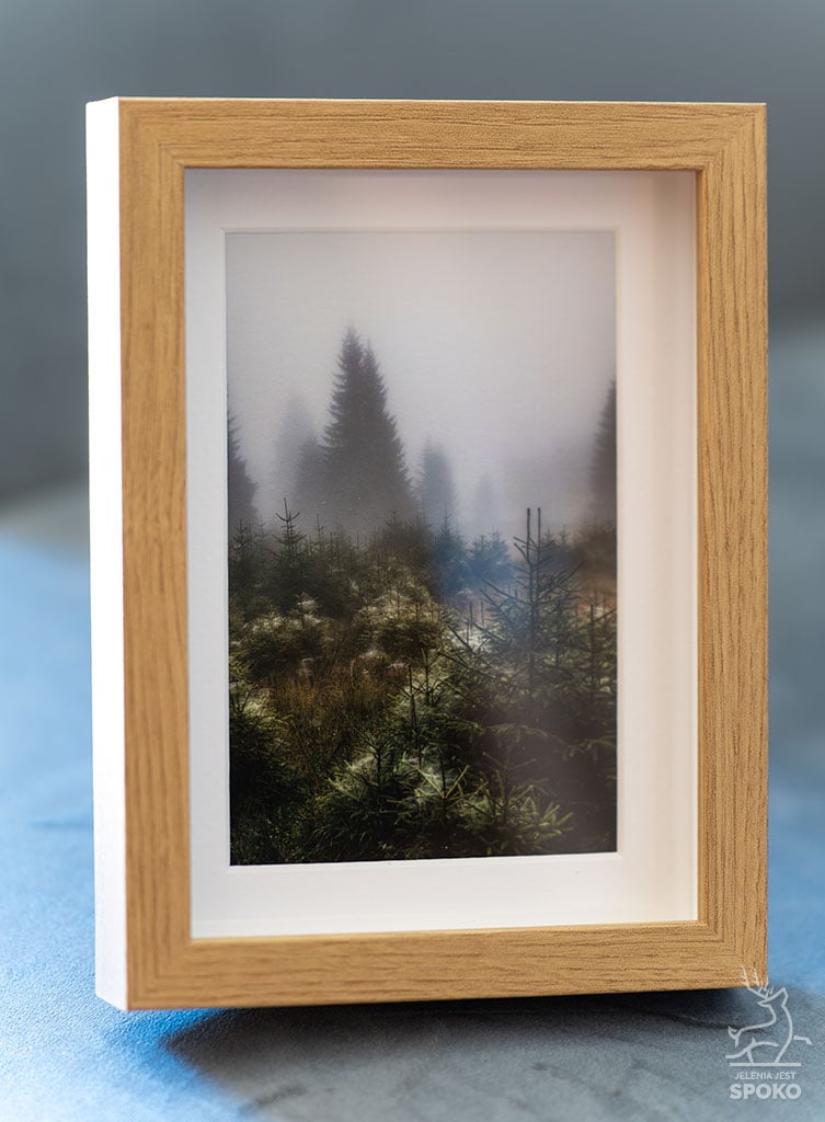 Gotowy do podziwiania zaraz po wyjęciu z pudełka SPOKO MiniWydruk Babie Lato w ramce, z passe-partout, czyli białą kartonową ramką wewnątrz obrazu wydobywającą dodatkową głębię z tego mistycznego widoku z Karkonoszy.
