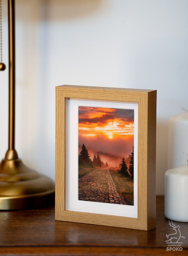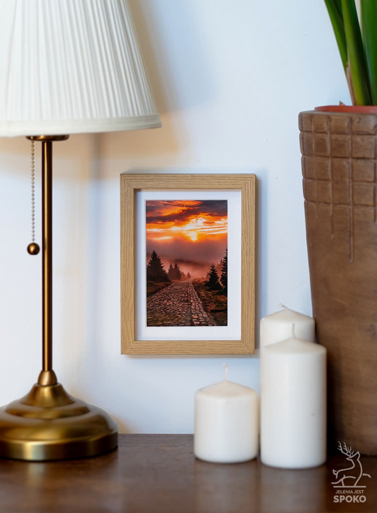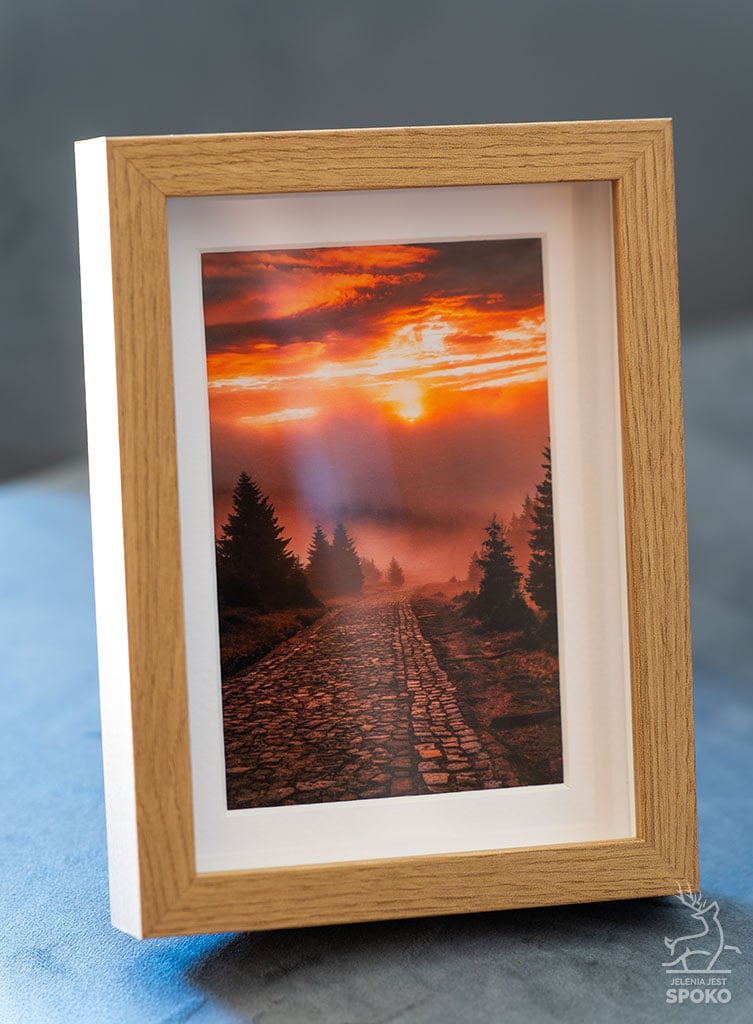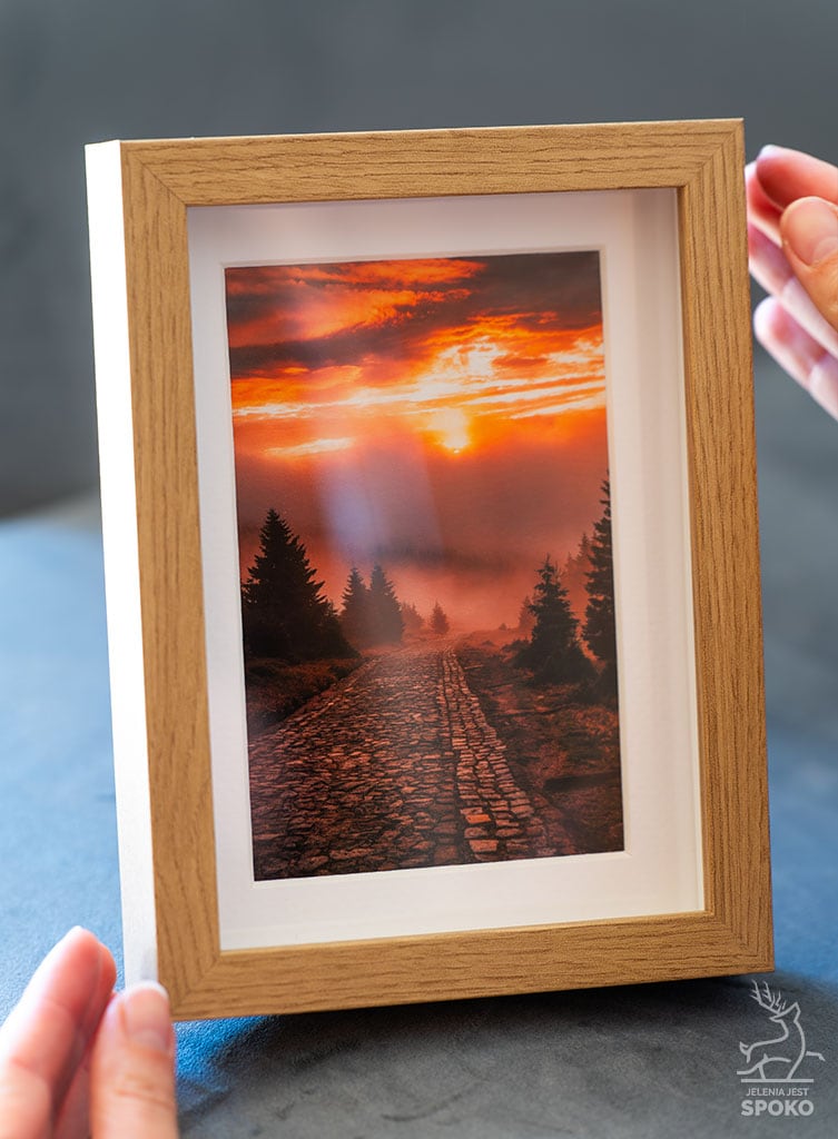 Gotowy do podziwiania zaraz po wyjęciu z pudełka SPOKO MiniWydruk Karkonoski Szlak w ramce, z passe-partout, czyli białą kartonową ramką wewnątrz obrazu wydobywającą dodatkową głębię z tego mistycznego widoku z Karkonoszy.