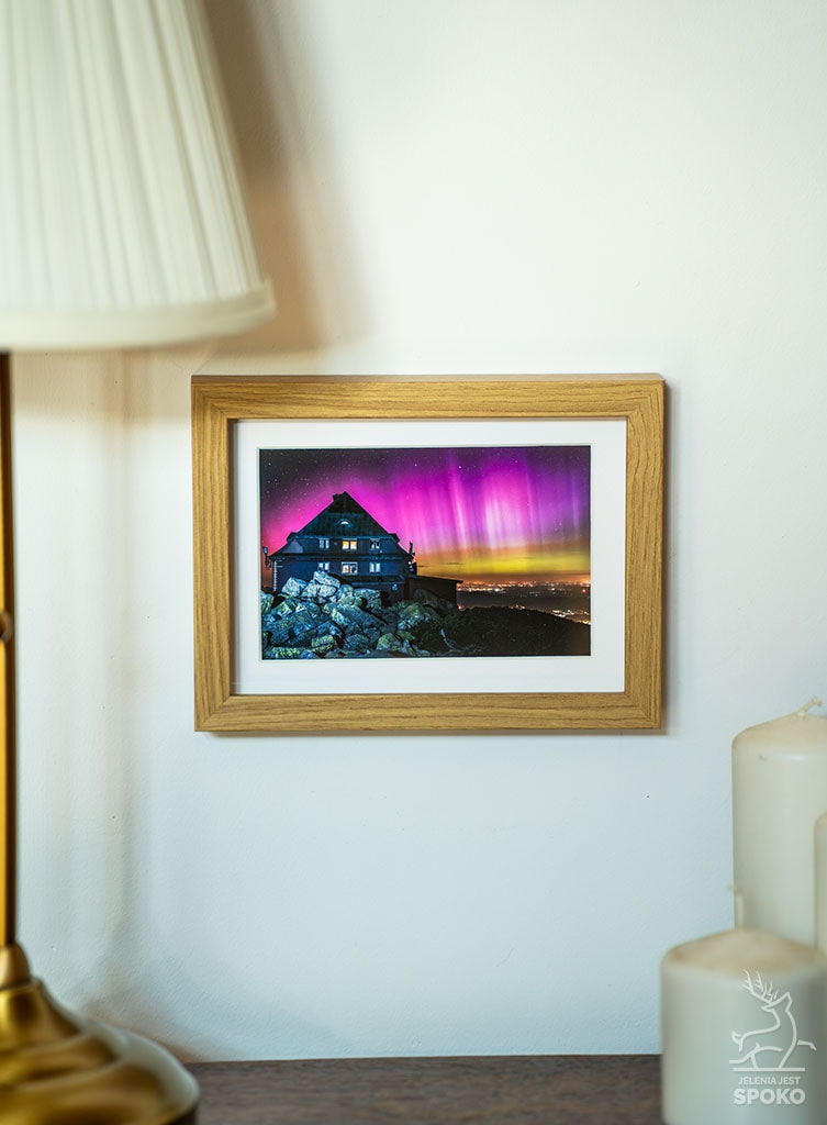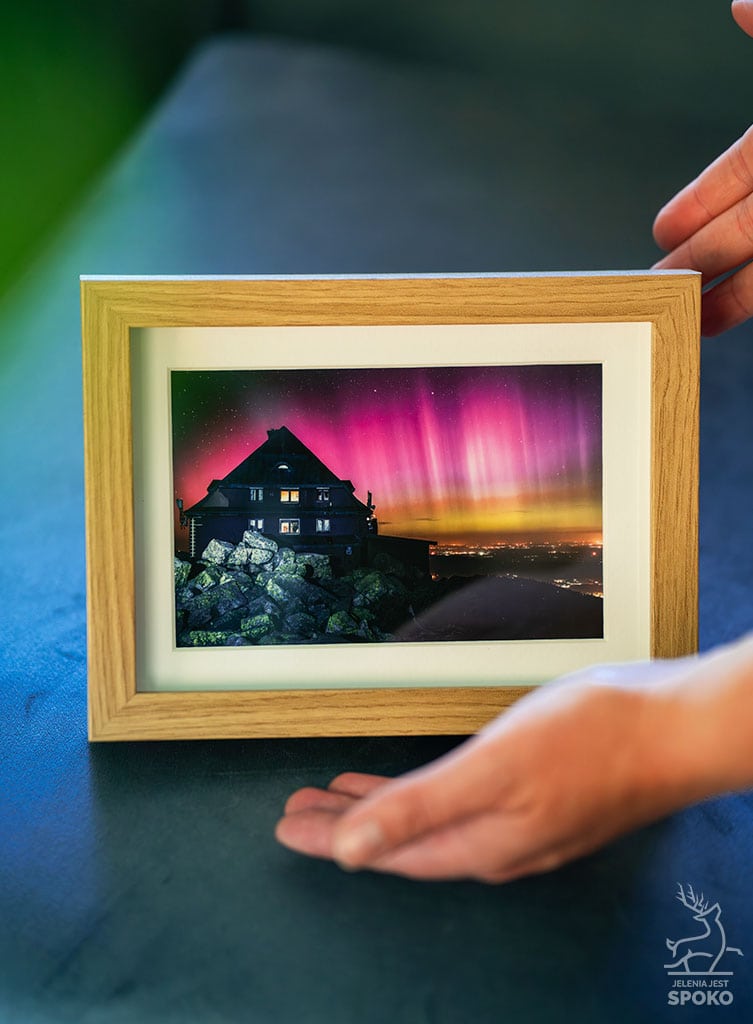 Gotowy do podziwiania zaraz po wyjęciu z pudełka SPOKO MiniWydruk Szrenica Zorza w ramce, z passe-partout, czyli białą kartonową ramką wewnątrz obrazu wydobywającą dodatkową głębię z tego nietuzinkowego widoku w Karkonoszach.